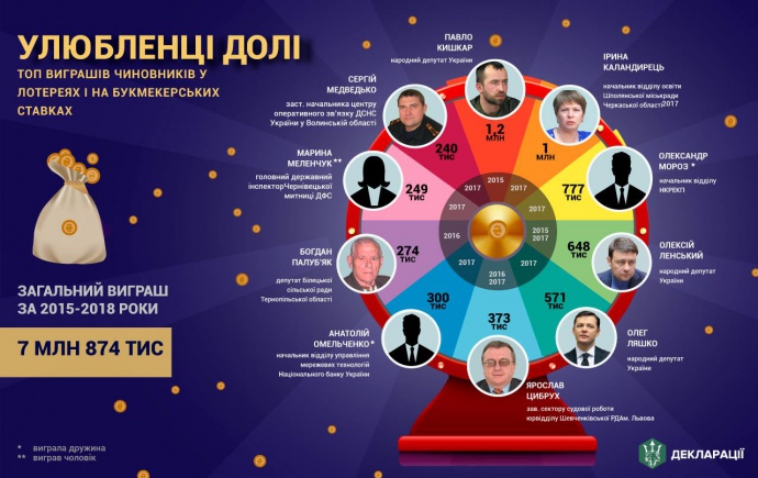 Украинские чиновники в 2015-2018 годах указали в своих декларациях выигрыши в лотереи и на букмекерских ставках в размере 7,874 миллиона гривень, сообщают "Наші гроші".