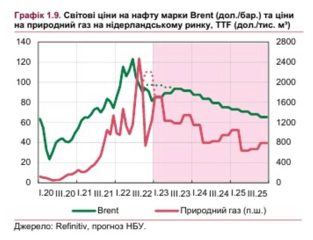 По данным НБУ, средняя цена нефти марки Brent в 2022 году выросла на 41,8% до 99,8 долларов за баррель. НБУ прогнозирует, что в 2023 году цена упадет на 9,9% до 89,9 долларов, в 2024 году на 9,5% до 81,4 долларов, в 2025 году на 14,6% до 69,5 долларов за баррель.