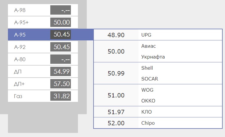 Отметим, что цена бензина А-95 на заправках Киевской области колебалась от 50 до 52 гривен за литр, дизель продавали в диапазоне от 53 до 57 гривен, а сжиженный газ по 30-33 гривны за литр.