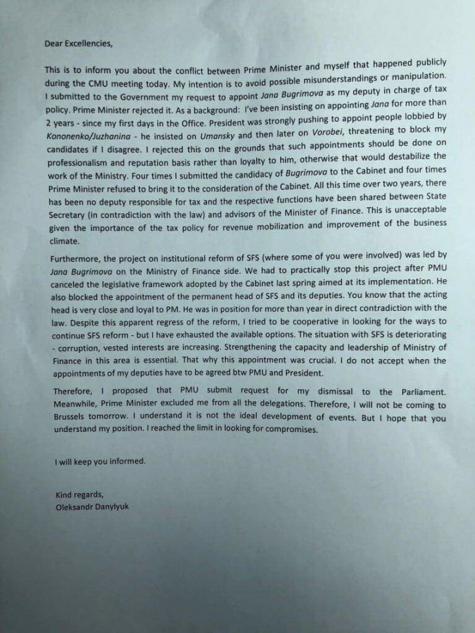 Данилюк, отставку которого предлагал генпрокурор Юрий Луценко, написал письмо к G7 с намерением "избежать двусмысленности и манипуляций" в его конфликте с премьер-министром Украины Владимиром Гройсманом. Причиной конфликта названо место заместителя министра, на которое Гройсман пытается назначить своего человека. Об этом пишет ЕП со ссылкой на письмо министра финансов в G7.