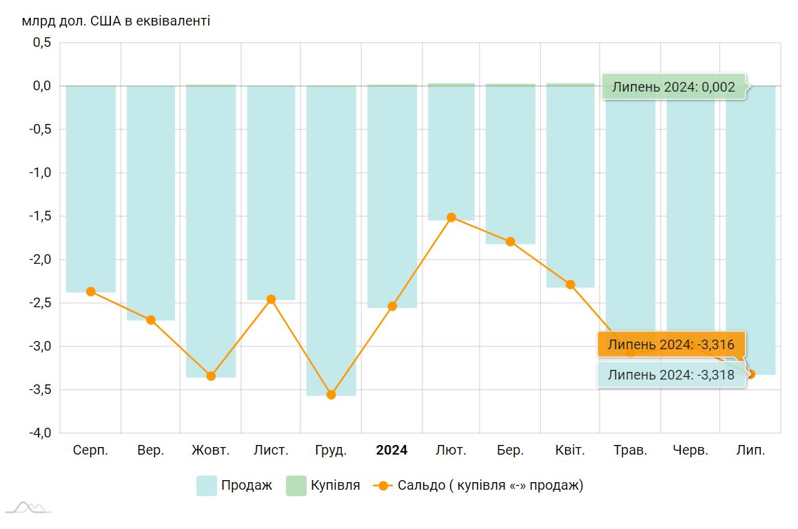 Нацбанк в прошлом месяце пытался удержать гривню от дальнейшей девальвации. Как результат, чистая продажа долларов регулятором в июле увеличилась по сравнению с июнем и составила $3,316 млрд.