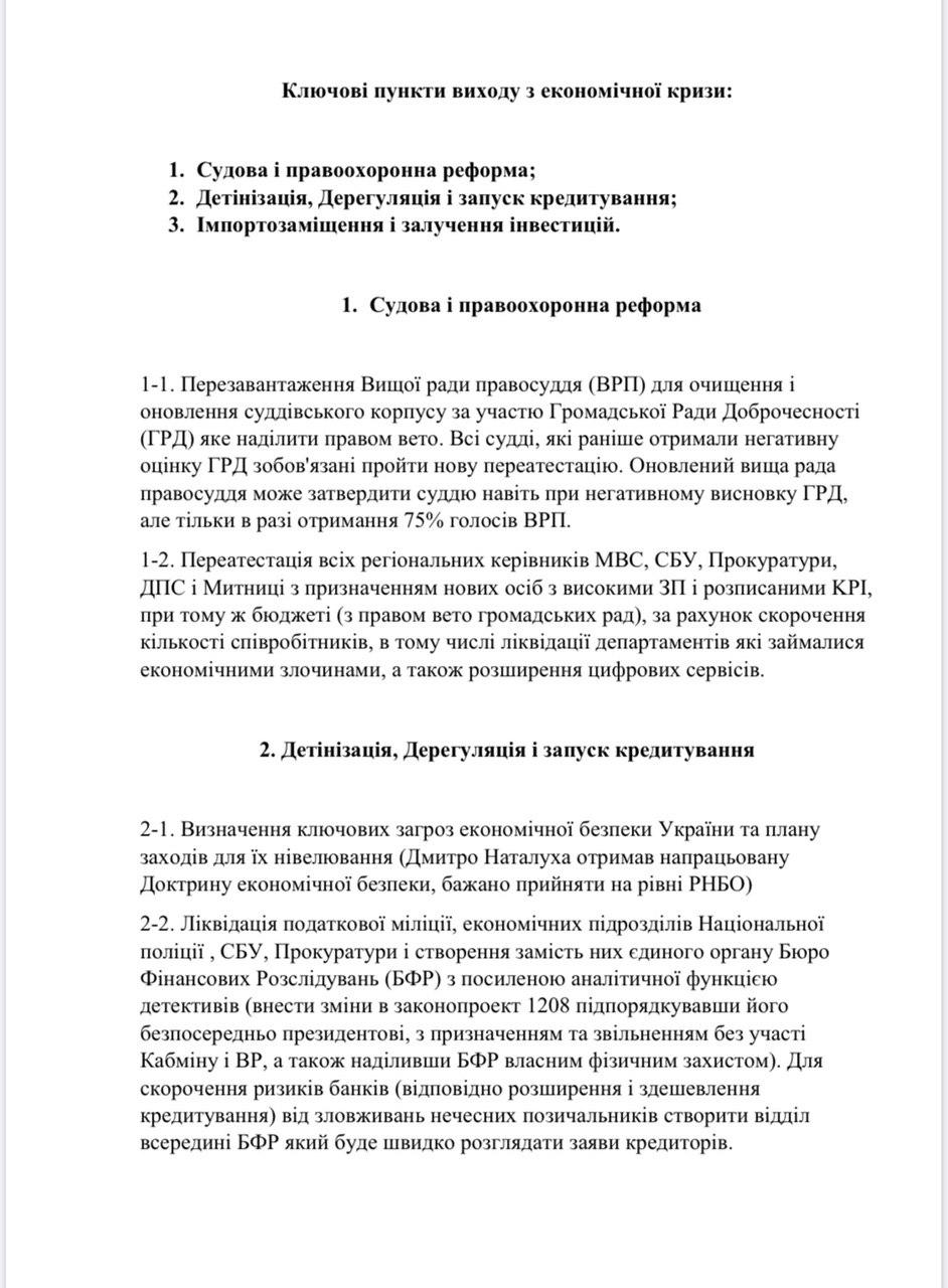 "Ликвидация налоговой милиции, экономических подразделений Национальной полиции , СБУ, Прокуратуры и создание вместо них единого органа Бюро Финансовых Расследований (БФР) с усиленной аналитической функцией детективов (внести изменения в законопроект 1208 подчинив его непосредственно президенту, с назначением и увольнением без участия Кабмина и ВР, а также наделив БФР собственным физическим защитой)", - говорится в документе.
