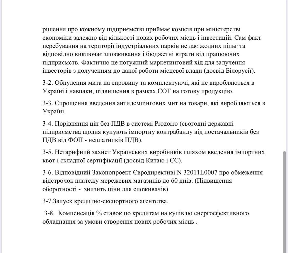 "Обнуления пошлины на сырье и комплектующие, которые не производятся в Украине и наоборот, повышение в рамках ВТО на готовую продукцию. Упрощение ввода антидемпинговых пошлин на товары, которые производятся в Украине", - добавляют авторы документа.