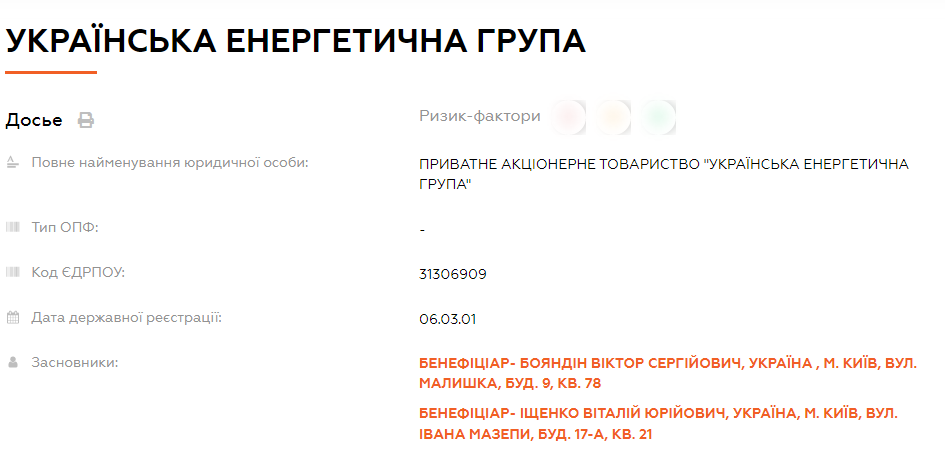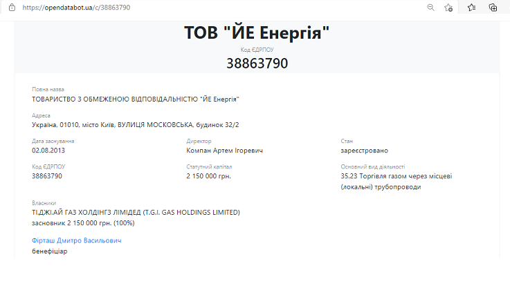 Однако, согласно государственным реестрам, под этим кодом ЕГРПОУ числится газоснабжающая компания, принадлежащая Дмитрию Фирташу - ООО "ЙЭ Энергия".