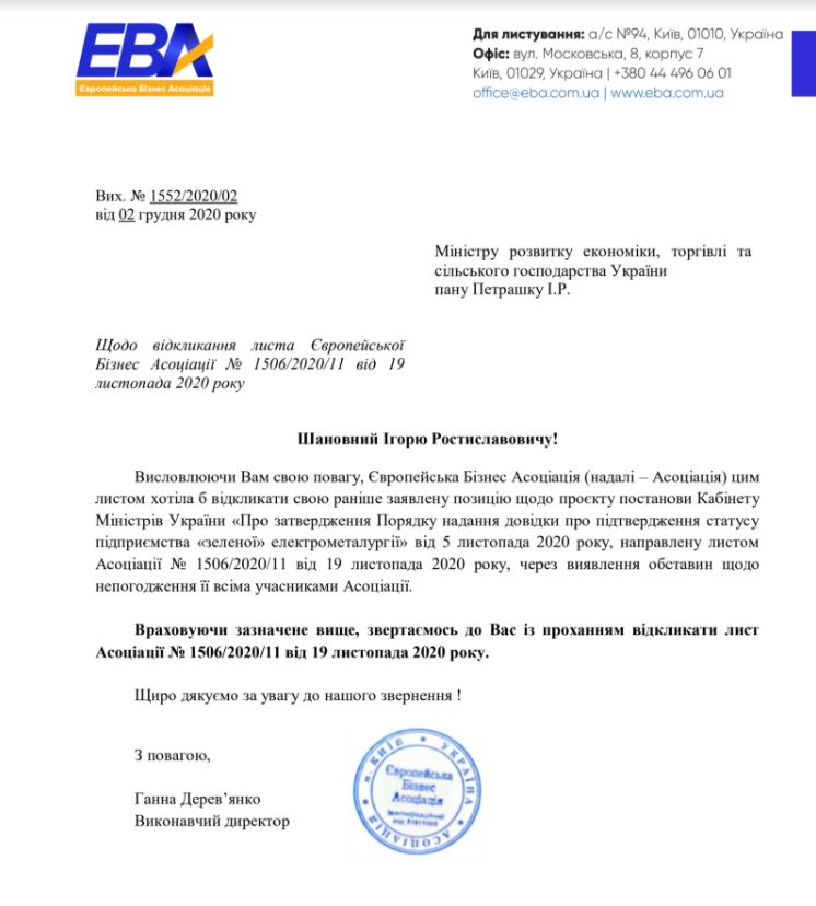 Европейская бизнес ассоциация (ЕБА) 2 декабря 2020 года отозвала свое письмо в адрес министра экономики Игоря Петрашко, в котором было подвергнуто критике предоставление финансовых стимулов для экологической модернизации промышленных предприятий, в частности – "зеленой" металлургии, сообщает Цензор.