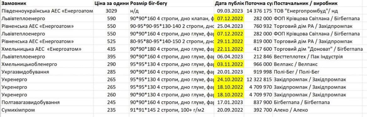 Сейчас рыночная цена биг-бегов колеблется в районе 250–300 грн. за штуку. В разгар обстрелов во время ажиотажного спроса цена росла где-то на 30% - до 300-400 грн. Но чтобы цена взлетала выше 500 грн — разве что только у перепродавцов и «Энергоатома» . По данным ZN.UA, ДТЭК и «Евро-реконструкция», например, также покупали биг-беги значительно дешевле 500 грн.