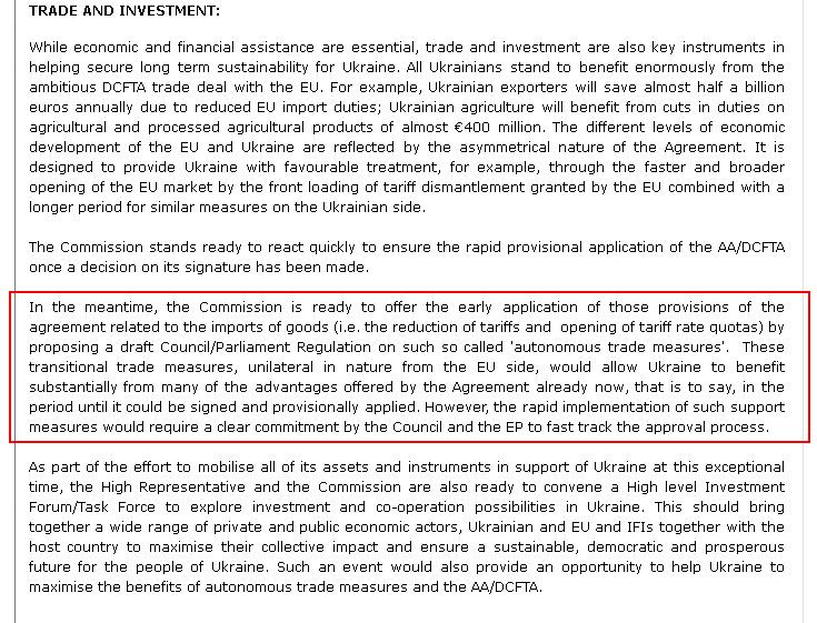 Баррозу отметил, что Евросоюз по-прежнему намерен подписать Соглашение об ассоциации с Украиной, включающее зону свободной торговли. Более того, подчеркнул он, Брюссель готов применить одно из положений ЗСТ в одностороннем порядке, не дожидаясь официального подписания ассоциации Украиной и ЕС.