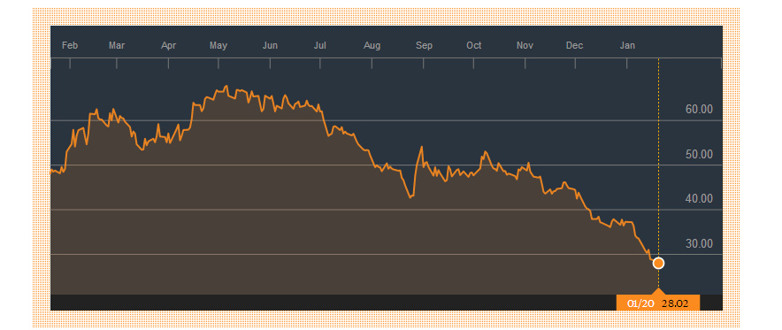 На сегодня нефть сорта Brent торгуется около $ 28 за баррель. Цена Brent 18 января падала до $ 27,67 - минимума с конца 2003 года.