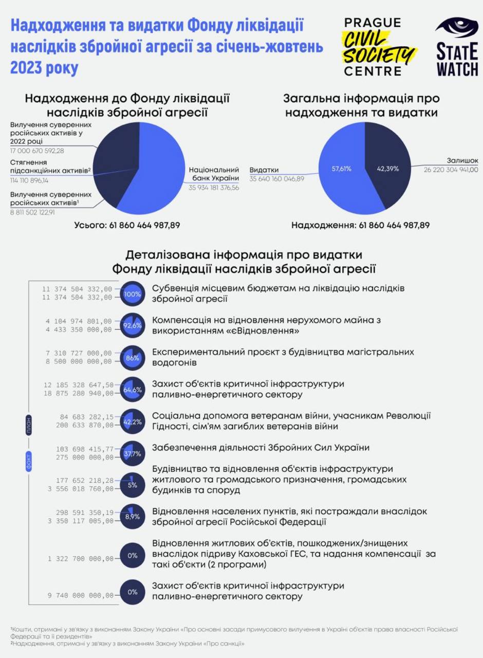 За десять месяцев текущего года расходы из Фонда ликвидации последствий вооруженной агрессии составили 35,6 млрд грн, то есть 58% от общей суммы Фонда в госбюджете на 2023 год, который составляет почти 61,8 млрд грн.