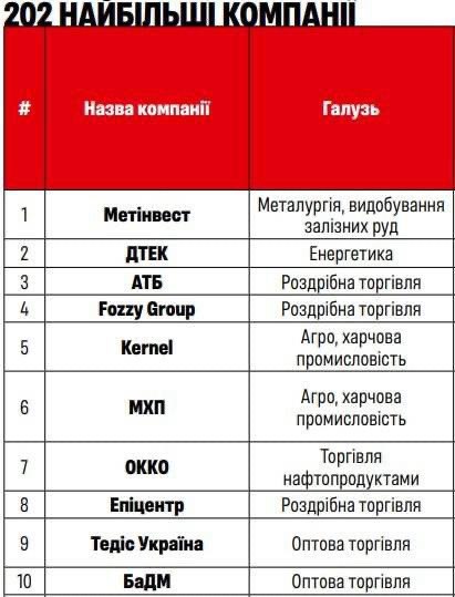 Журнал Forbes Ukraine обнародовал рейтинг крупнейших частных компаний Украины с выручкой от 4,7 миллиарда гривень. На первом месте оказалась компания Метинвест Рината Ахметова, которая в прошлом году выручила 270,5 млрд грн. В первую пятерку также вошли ДТЭК, АТБ, Fozzy Group и Kernel, сообщили в пресс-службе Метинвеста.