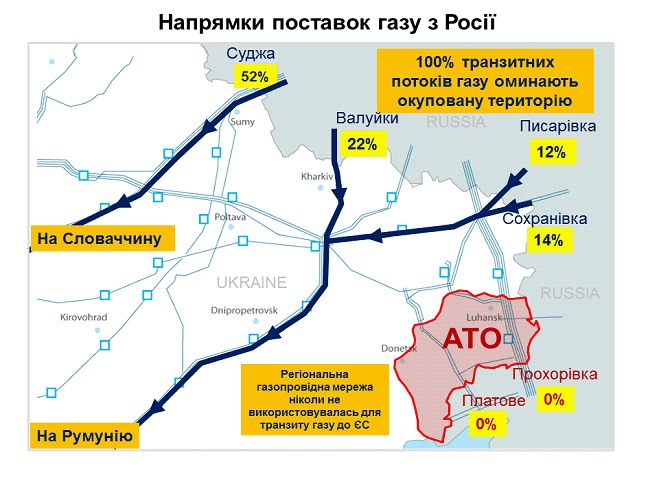 В нарушение положений контракта, начиная с 22 февраля 2015 года, "Газпром" выполняет заявку "Нафтогаза" на поставку оплаченных объемов газа только на 40%, направляя определенный объем газа на ГИС "Платово" и "Прохоровка", которые находятся на не подконтрольной Украине территории Донецкой и Луганской областей.