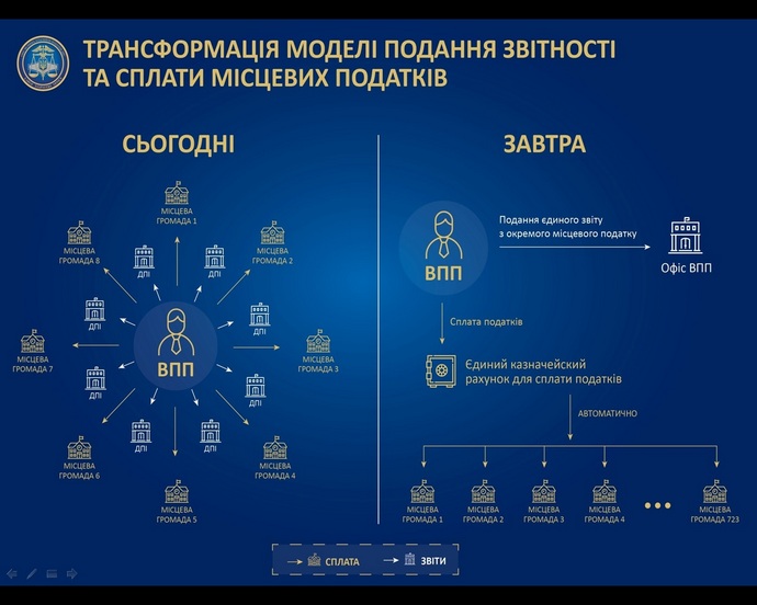 Внедрение единого счета для уплаты налогов (кроме НДС и акциза по реализации топлива) предусматривает подачу единой декларации по местным налогам с автоматическим разнесением средств на счета территориальных общин.