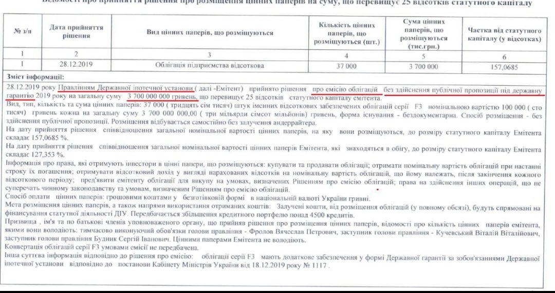 Государственное ипотечное учреждение (ГИУ) планирует выпуск облигаций на общую сумму 3,7 млрд грн. Правление ГИУ 28 декабря 2019 года приняло решение об эмиссии ценных бумаг без публичного предложения под государственные гарантии.