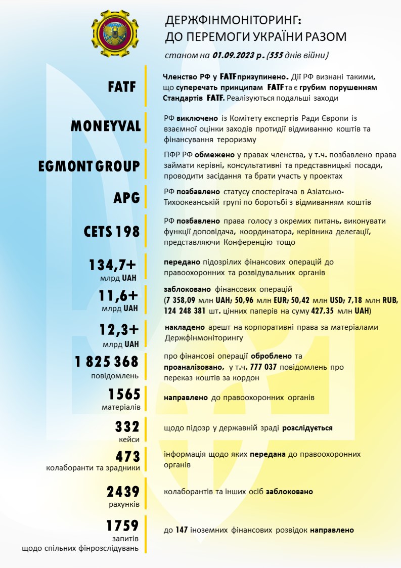 Так, по состоянию на свиту сентября в соответствующие органы о подозрительных финансовых операциях передана информация на сумму 134,7 млрд грн.