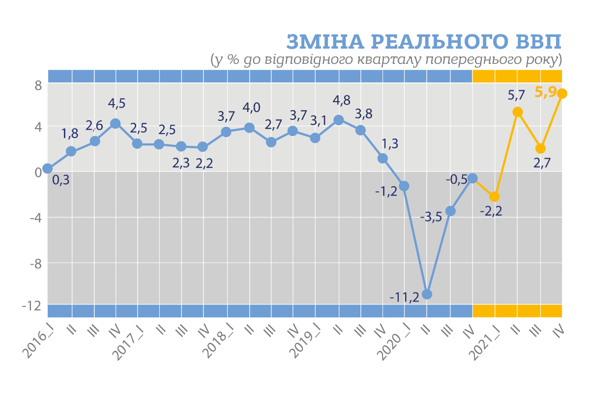 В последнем квартале 2021 года (октябрь-декабрь) реальный валовой внутренний продукт Украины, который считается в количественном измерении, вырос на 5,9% по сравнению с аналогичным периодом 2020 года, когда экономика упала на 0,7%. Такими данными поделилась Государственная служба статистики.