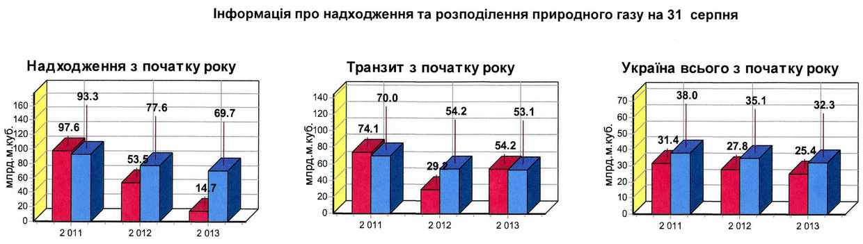 Транзит российского газа через территорию Украины в страны Западной Европы за 8 мес. (январь-август) 2013 года составил 53,1 млрд куб. м. По сравнению с январем-августом прошлого 2012 года транзит российского газа в Европу сократился всего на 2,0%, или на 1,138 млрд куб. м (с 54,2 млрд куб. м газа).