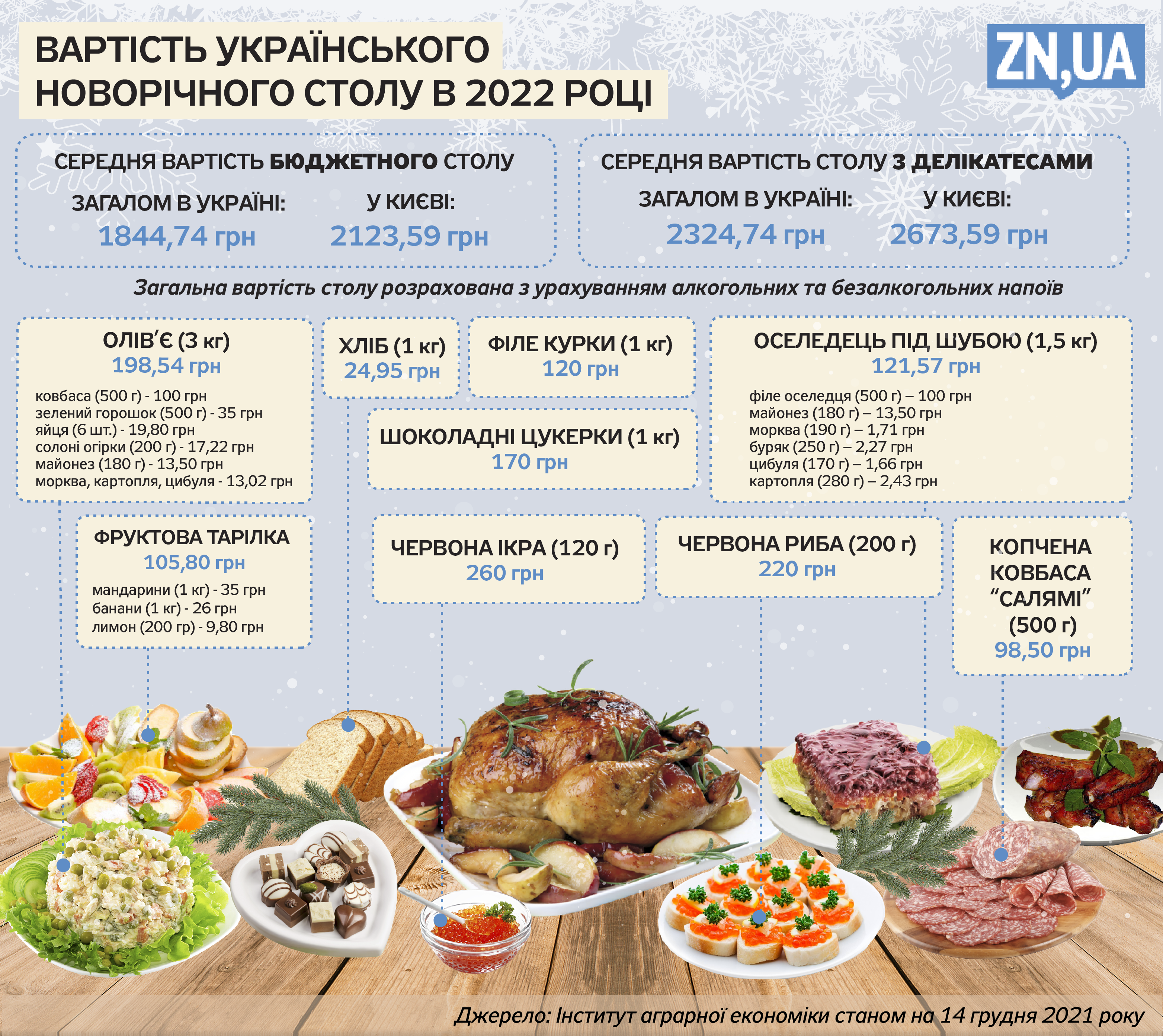 Для сравнения, средняя стоимость новогоднего стола 2021 в Украине для семьи из 4 человек по сравнению с стоимость новогоднего стола 2020 выросла на 5,3% и составляла 1706,09 грн. Об этом также сообщал Национальный научный центр "Институт аграрной экономики".