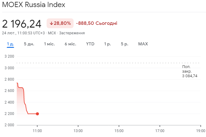 В 10 часов утра по Москве операции на Московской бирже, ранее приостановленные в связи с повышенной волатильностью на фоне военной агрессии РФ против Украины, возобновились. Однако Российская биржа открылась провалом индекса РТС на 34,5%, индекс Мосбиржи просел на 28,8%.