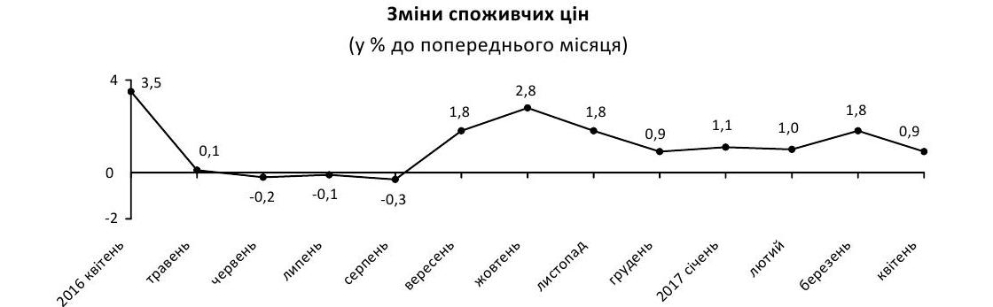 Потребительские цены в Украине в апреле 2017 года по сравнению с мартом выросли на 0,9%, сообщает Государственная служба статистики. Месячная инфляция замедлилась по сравнению с январем (1,1%), февралем (1,0%) и мартом (1,8%).