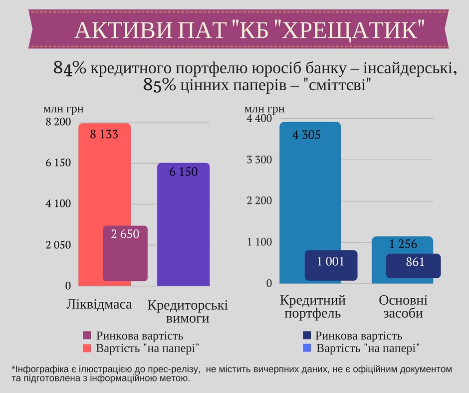 84% кредитного портфеля юридических лиц банка "Хрещатик" на сумму 3,38 миллиардов гривен - инсайдерские кредиты, 85% ценных бумаг – мусорные, сообщает Фонд гарантирования вкладов физическими лиц.