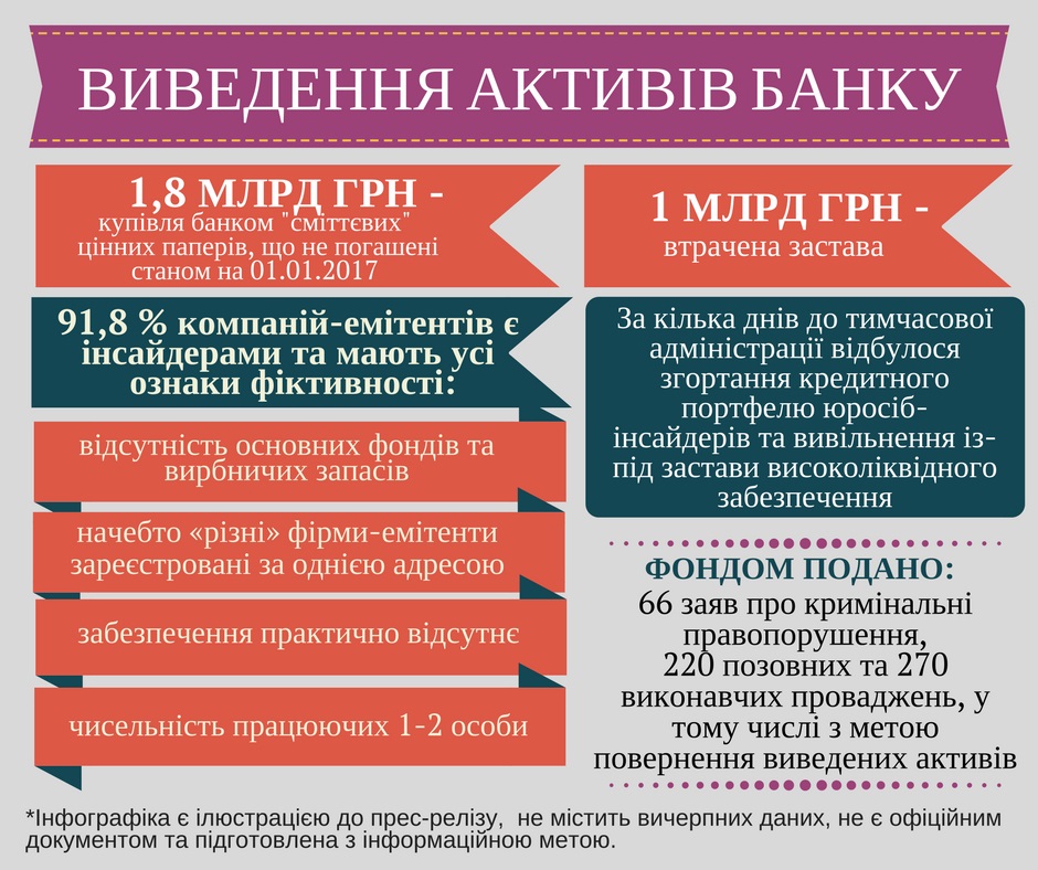 За несколько дней до введения временной администрации руководством и акционерами банка было применено схему, результатом которой стало сворачивание задолженности ряда связанных юридических лиц и высвобождения из-под залога высоколиквидного обеспечения, стоимостью почти 1 млрд грн.