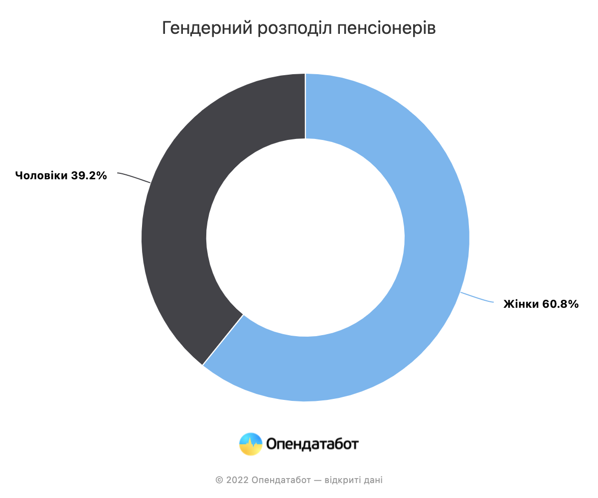 Так, на начало октября в Украине насчитывалось 10 726 239 пенсионеров, из которых 6,5 миллионов женщин (60,8%) и 4,2 миллиона мужчин (39,2%).