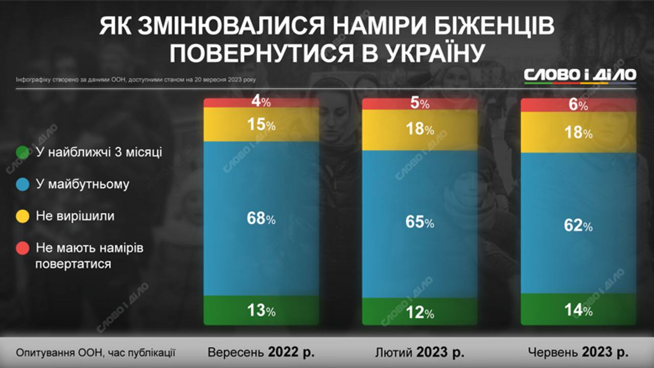 Согласно прошлогоднему опросу: 68% украинских беженцев хотели бы в будущем вернуться в Украину; в ближайшие три месяца этого хотели бы 13% опрошенных; при этом 15% украинцев тогда еще не решили, что делать; только 4% не собирались назад.