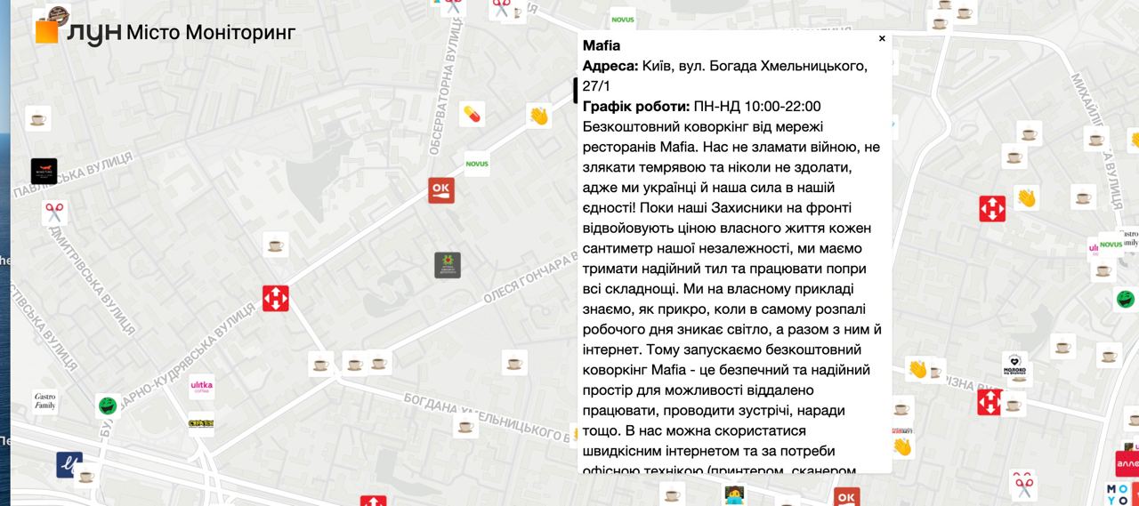 В критической ситуации с отсутствием света незаурядную социальную ответственность в Украине проявил бизнес, который начал безвозмездно предоставлять украинцам услуги интернета и снабжать электроэнергией во время отключений. Интерактивную карта заведений, которые могут работать даже при выключении электричества, можно посмотреть как на сайте, так и в приложении.