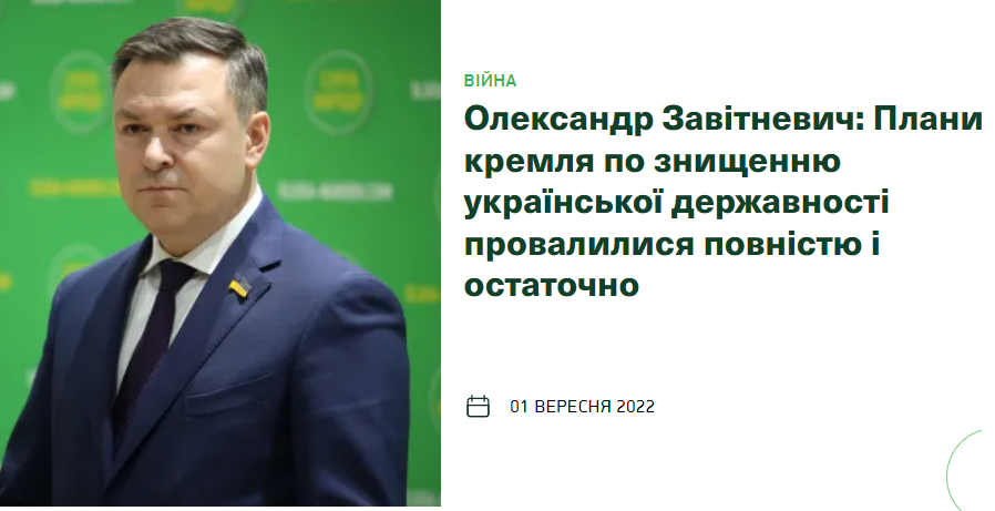 Последнюю публичную активность главы оборонного Комитета ВР Александра Завитневича удалось найти на партийном сайте "Слуги народа". В частности, в начале сентября депутат был убежден, что планы Кремля по уничтожению украинской государственности провалились полностью и окончательно.
