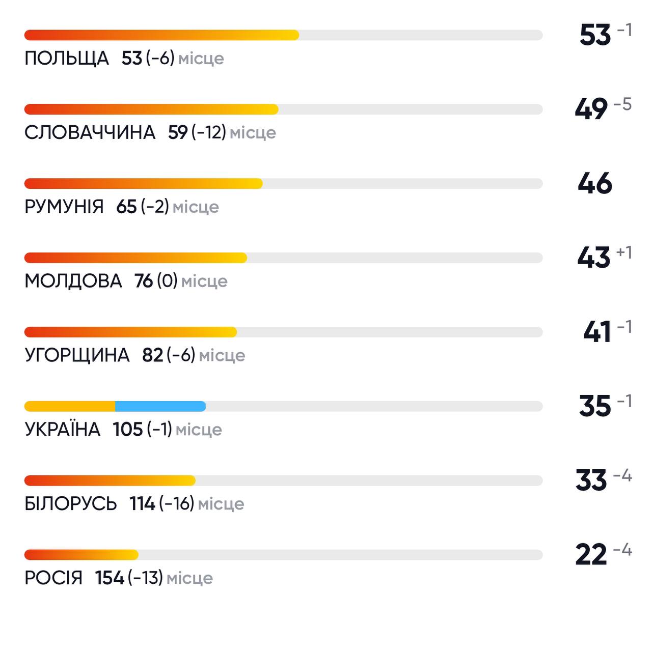 Учитывая результаты предыдущих исследований, Украина за год потеряла один балл по 100-балльной системе и опустилась на одну позицию.