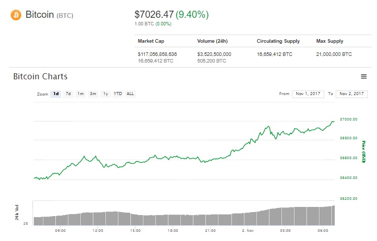 В течение торгов в четверг, 2 ноября, стоимость Bitcoin преодолела уровень $ 7000 и примерно в 9:05 установила новый исторический максимум в $ 7026,47, что на 9,4% выше уровня закрытия торгов предыдущего дня.