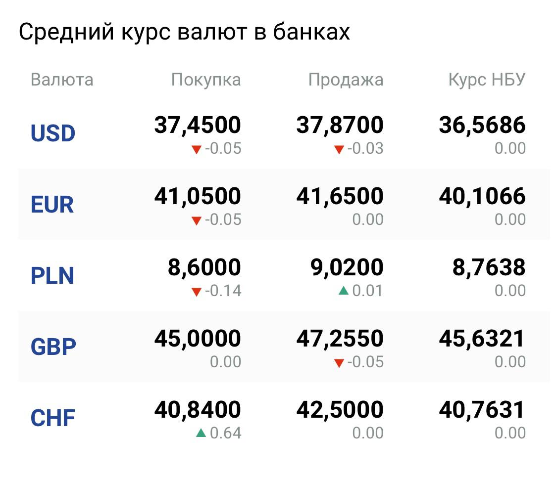 Средний курс покупки – 37,65 грн. Средний курс продажи 37,73 грн.