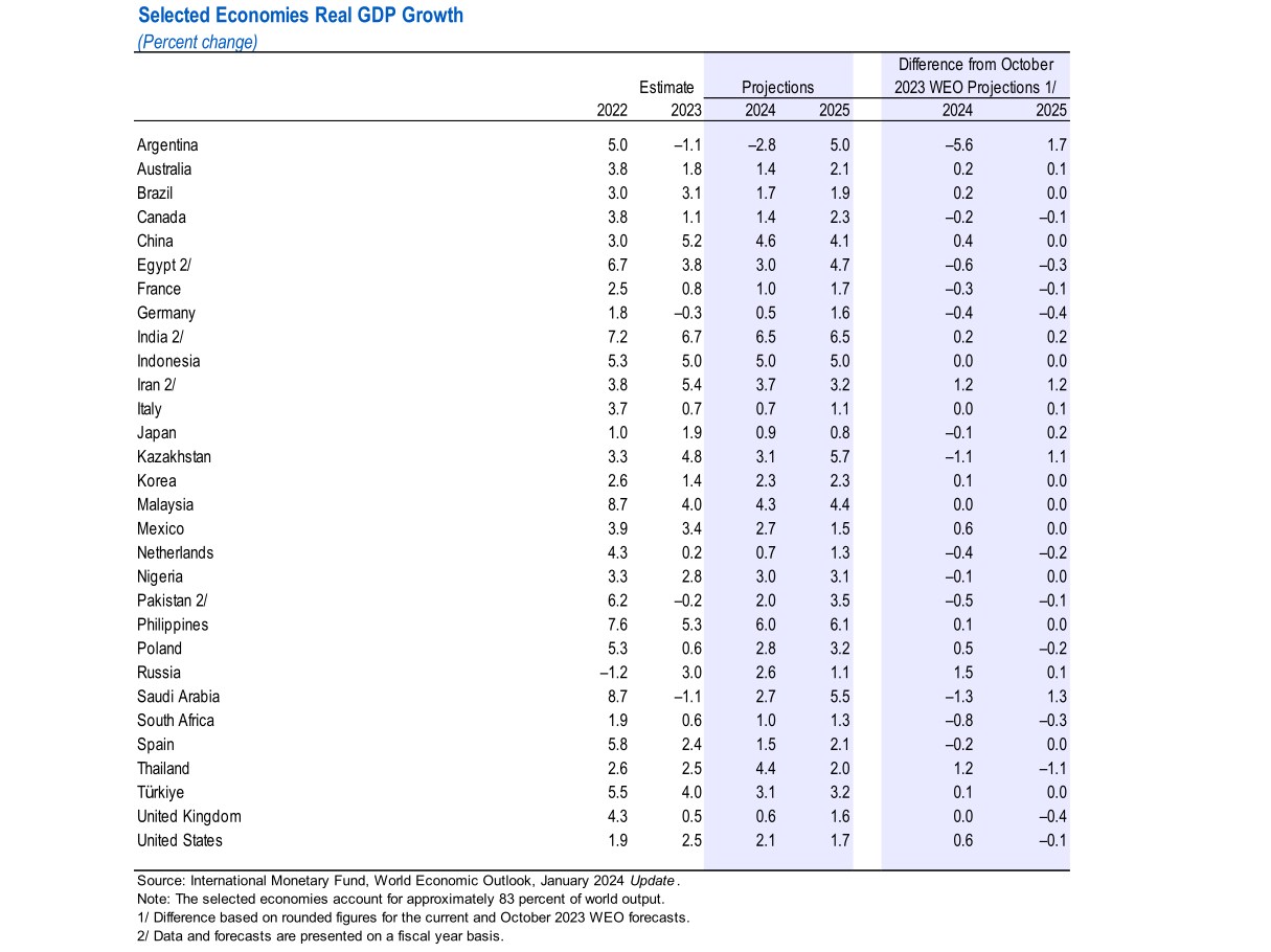 В целом глобальный рост прогнозируется на уровне 3,1% в 2024 году и 3,2% в 2025 году. МВФ в новой оценке экономики говорит, что на экономику влияет активная деятельность центрального банка в США, пытающаяся поглотить последствия инфляции. Это вынуждает сокращать программы поддержки бизнеса и становится дополнительным бременем для ведущих экономик мира.