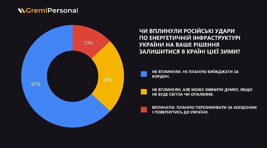 Только 13% жителей Харьковской, Винницкой, Львовской, Днепропетровской, Запорожской, Киевской, Ивано-Франковской и Житомирской областей планируют переезд из-за ракетных ударов по энергетической инфраструктуре. Об этом свидетельствует опрос Аналитического центра международной компании по трудоустройству Gremi Personal.