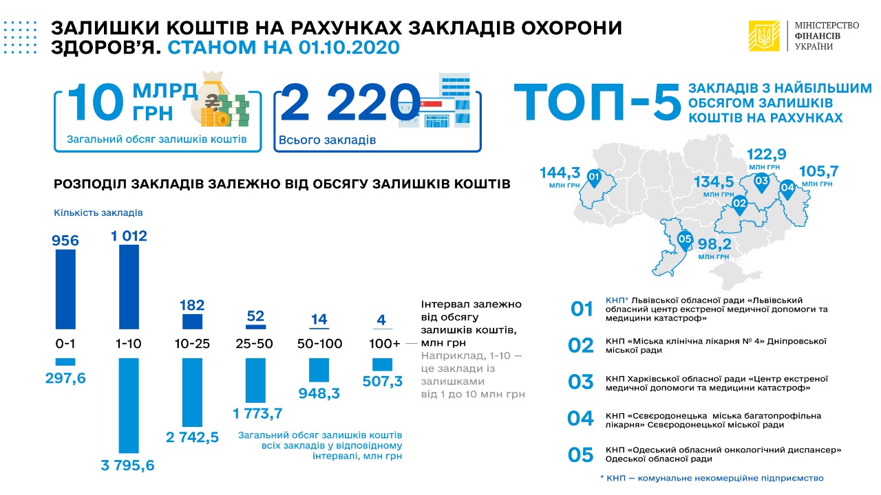 Почти половина учреждений здравоохранения (1012 заведений) имели остатки средств на счетах в размере от 1 до 10 млн грн. Общая сумма остатков на счетах этих учреждений составила 3 795,7 млн грн.