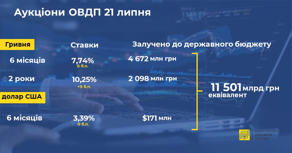 Сегодня, 21 июля, Министерство финансов Украины по итогам аукциона по размещению облигаций внутреннего государственного займа (ОВГЗ) привлекло в государственный бюджет эквивалент 11,5 млрд грн.