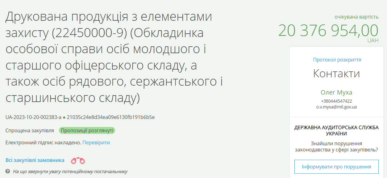 Уточняется, что в заказе указано, что это обложки "личного дела лиц младшего и старшего офицерского состава, а также рядового, сержантского и старшинского состава". Тендер обнародовали 20 октября, а 31 числа был конечный срок подачи предложений.