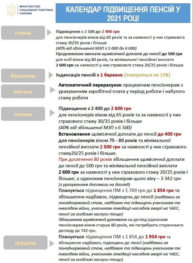 В декабре 2021 года планируется повышение минимальной пенсии с 1854 грн до 1934 грн, а также увеличение надбавок за сверхнормативный стаж, надбавок участникам и инвалидам войны, чернобыльцам и т.д.).