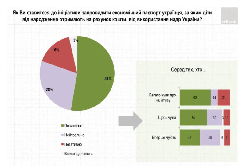 У соотечественников неоднозначное отношение к идее президента Зеленского о введении экономического паспорта. При этом 53% опрошенных украинцев положительно относятся к идее, 28% – нейтрально, 16% – отрицательно. Об этом свидетельствуют результаты опроса социологической группой "Рейтинг".