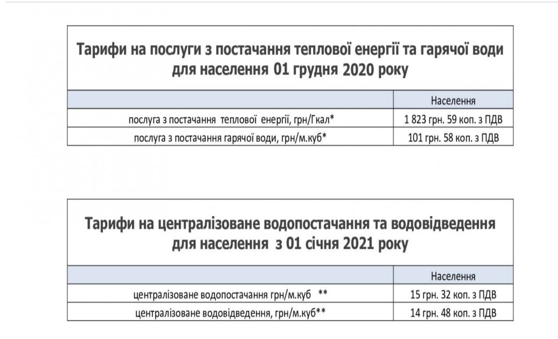 В утвержденном проекте решения указаны все тарифы, которые будут подняты. Тарифы на нужды населения отныне равняются: 2 256,23 гривен за Гкал тепловой энергии и 125,88 гривен за м3 горячей воды. Для бюджетных учреждений: 3 925,91 гривен за Гкал тепловой энергии, и 195,38 гривен за м3 горячей воды. Другие пользователи будут платить по 3 962,16 гривен за Гкал тепла и по 202,79 гривен за м3 горячей воды. У религиозных организаций тариф составляет 3 834,89 гривен за Гкал тепловой энергии.