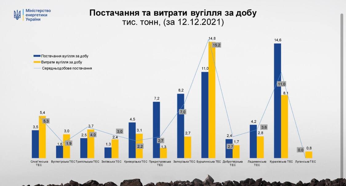 При этом суточные расходы угля превышают поставки на таких ТЭС: Славянской, Углегорской (государственной "Центрэнерго"), Трипольской (Центрэнерго), Змиевской (Центрэнерго), Бурштынской (ДТЭК Рината Ахметова) и Луганской (ДТЭК) теплоэлектростанциях.