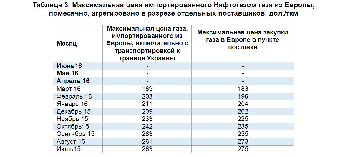 Приведенные в таблицах цены на природный газ указаны без учета стоимости распределения мощности в точке входа в газотранспортную систему Украины. С 1 января 2016 года государственный регулятор НКРЭКУ установил эту стоимость на уровне 12,47 дол./ткм.