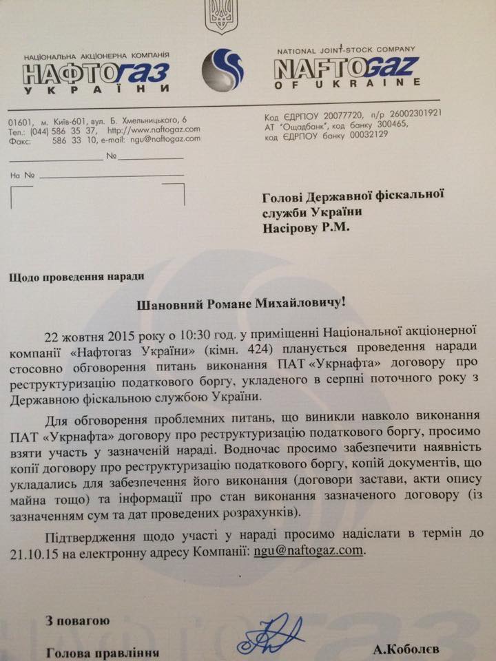 Соответствующие письма, которые глава правления "Нафтогаза" Андрей Коболев направил на имя главы ГФС Романа Насирова и главе правления "Укрнафты" Марку Роллинзу, обнародовало агентство "РБК-Украина".