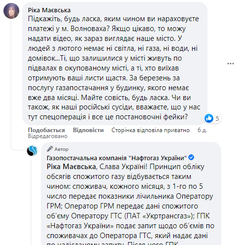 "Каким образом вы начисляете платежи в г. Волноваха? Если интересно, то могу предоставить видео, как сейчас выглядит наш город. У людей с февраля нет ни света, ни газа, ни воды, ни домов...Оставшиеся в городе живут по подвалам в оккупированном городе, а уехавшие получают ваши письма счастья. За март за услугу газоснабжения в доме, которого нет уже два месяца. Имейте совесть, пожалуйста. Или вы также, как наши российские соседи, считаете, что у нас здесь спецоперация и все это постановочные фейки?", – говорится в одном из комментариев.