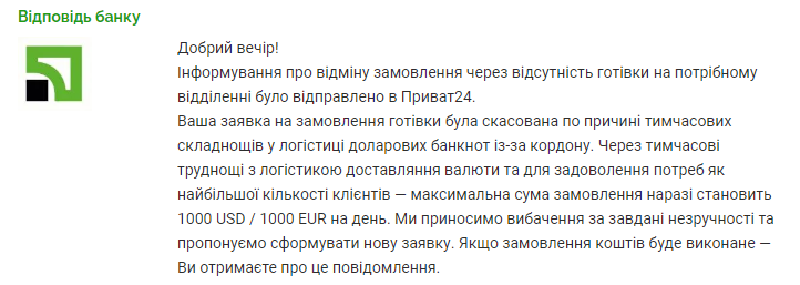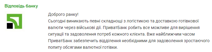 "Уже в ближайшее время ПриватБанк обеспечит отделения необходимыми для удовлетворения растущего спроса объемами валютной наличности", - говорится в ответе.