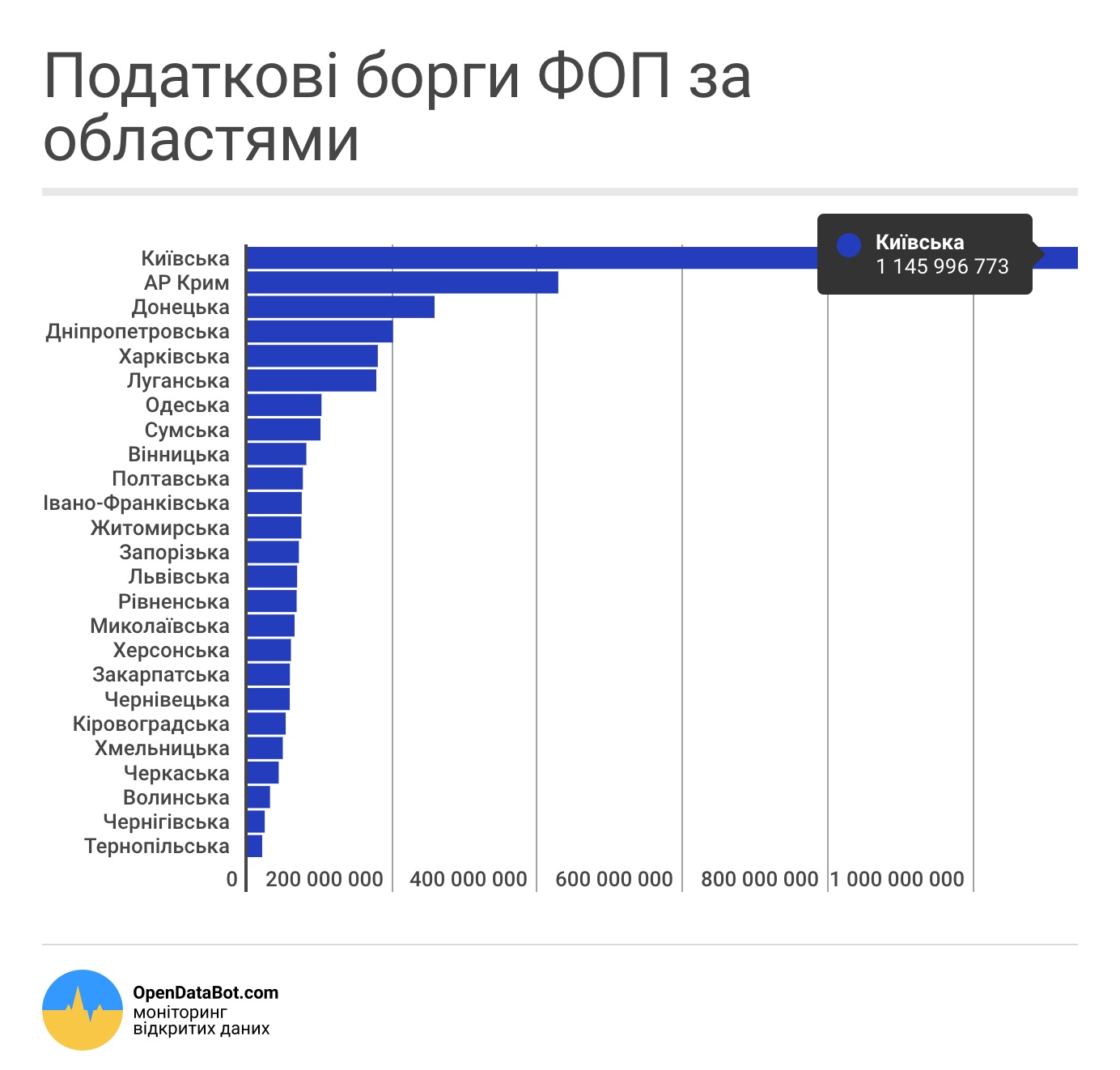Всего задолженность ФЛП составила 3,5 миллиарда гривень, в частности долг в госбюджет - более 1,5 млрд грн, в местные бюджеты - более 2 млрд грн.