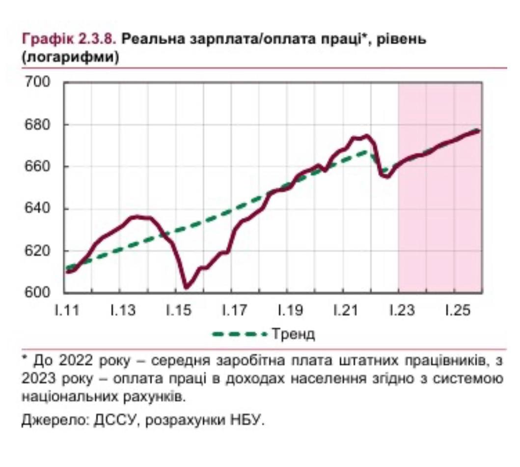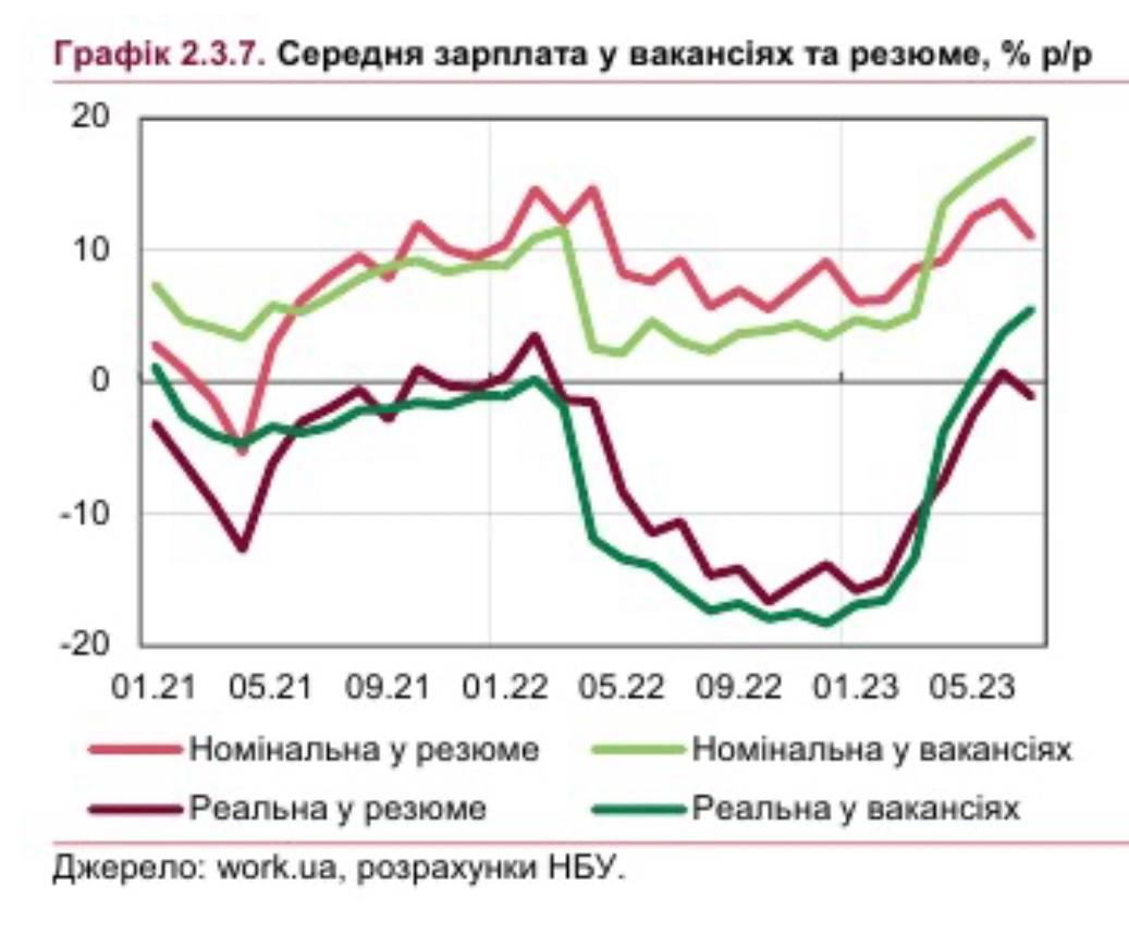 Опосредованные оценки по налоговым данным, а также по зарплатам, предлагаемым в вакансиях на сайтах поиска работы, свидетельствуют, по меньшей мере, о дальнейшем росте номинальной оплаты труда. А по данным о выплате зарплат на карточки банков - росла и оплата труда в реальном измерении. Это, в частности, объясняется и замедлением инфляции, отмечают в НБУ.