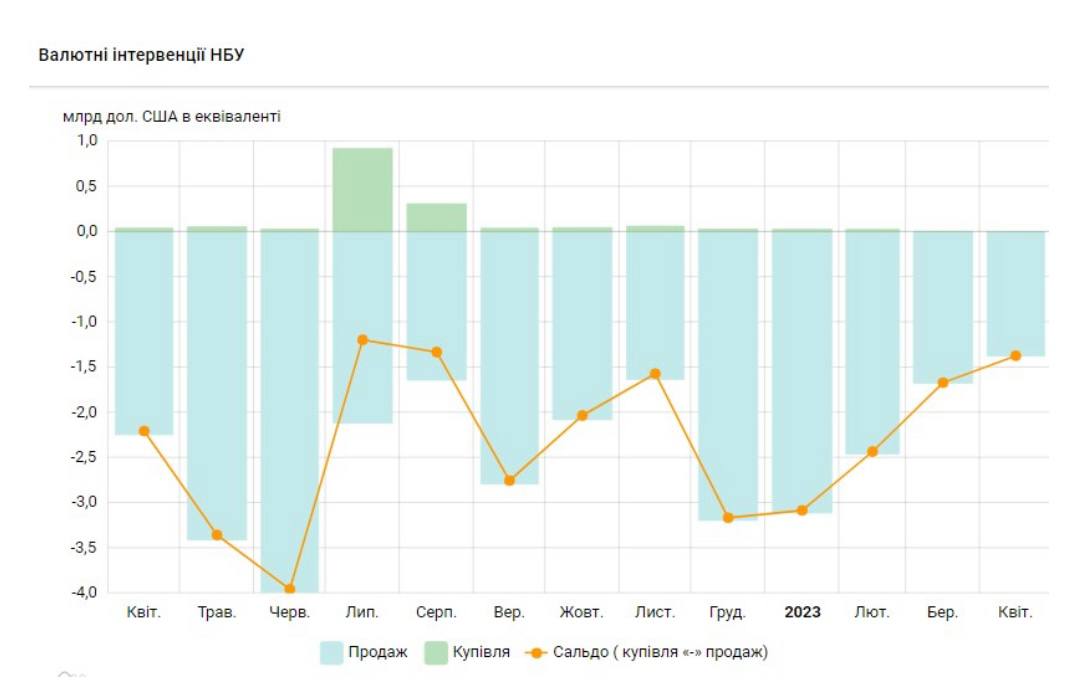 Национальный банк Украины (НБУ) в течение апреля 2023 года купил на межбанковском валютном рынке всего 3,7 млн долларов и продал 1 374,1 млн долларов. Отрицательное сальдо составило 1 370,4 млн долларов. Об этом свидетельствуют данные НБУ.