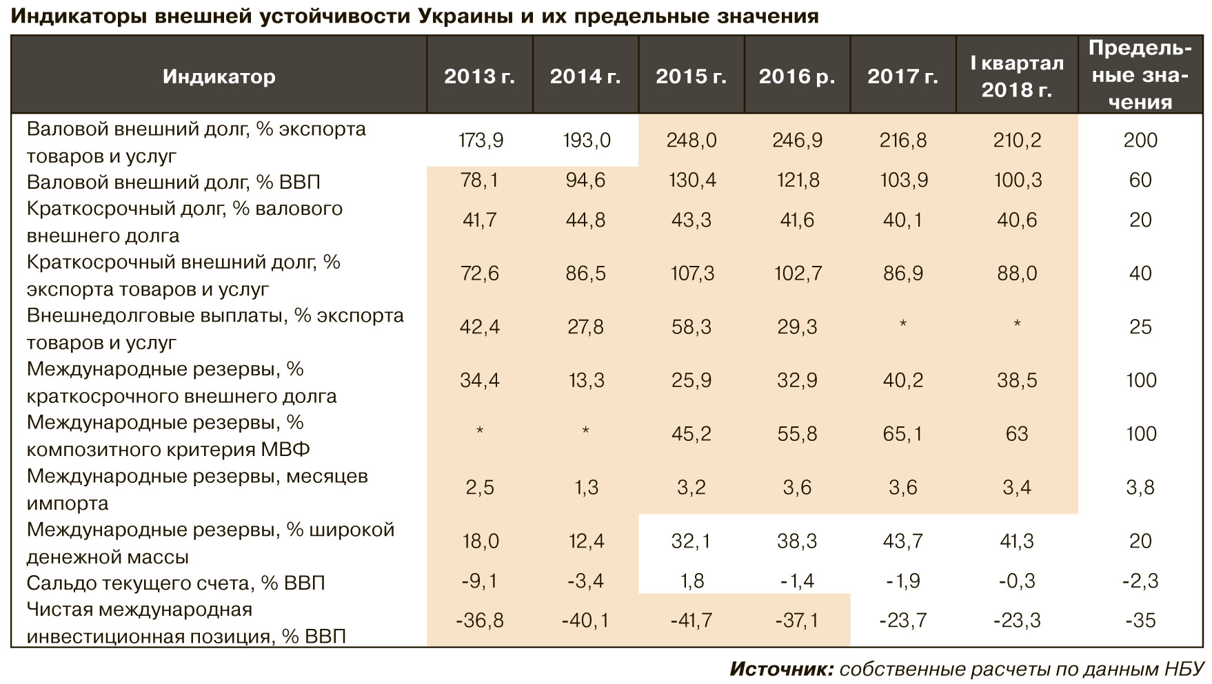 "В I квартале 2018 года из 11 индикаторов внешней устойчивости только три: сальдо текущего счета, чистая международная инвестиционная позиция и международные резервы в % к денежной массе - показали низкий степень уязвимости к воздействию шоковых ситуаций (белый фон в табл.). По 8-ми индикаторам размера внешнего долга, долговых выплат и величины международных резервов страны уровень соответствующих рисков был оценен как очень высокий (желтый фон в табл.), - пишет эксперт. - Таким образом, значительный дефицит торгового баланса, низкий уровень международных резервов, отрицательное сальдо международной инвестиционной позиции, чрезмерные объемы внешнего долга Украины и непосильное бремя долговых выплат сигнализируют о возможности наступления долгового кризиса и кризиса платежного баланса в нашей стране в недалеком будущем".