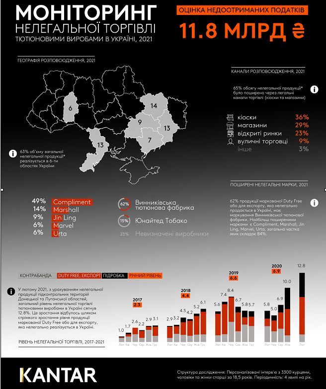 Согласно данным проекта "Мониторинг нелегальной торговли табачными изделиями в Украине", который проводит "Кантар" по заказу ведущих отечественных производителей табачных изделий, входящих в ТОП-10 налогоплательщиков в Украине, в феврале 2021, с учетом нелегальной продукции подконтрольных территорий Донецкой и Луганской областей, общий уровень нелегальной торговли табачными изделиями в Украине достиг 12,8%.